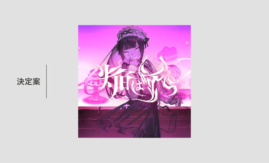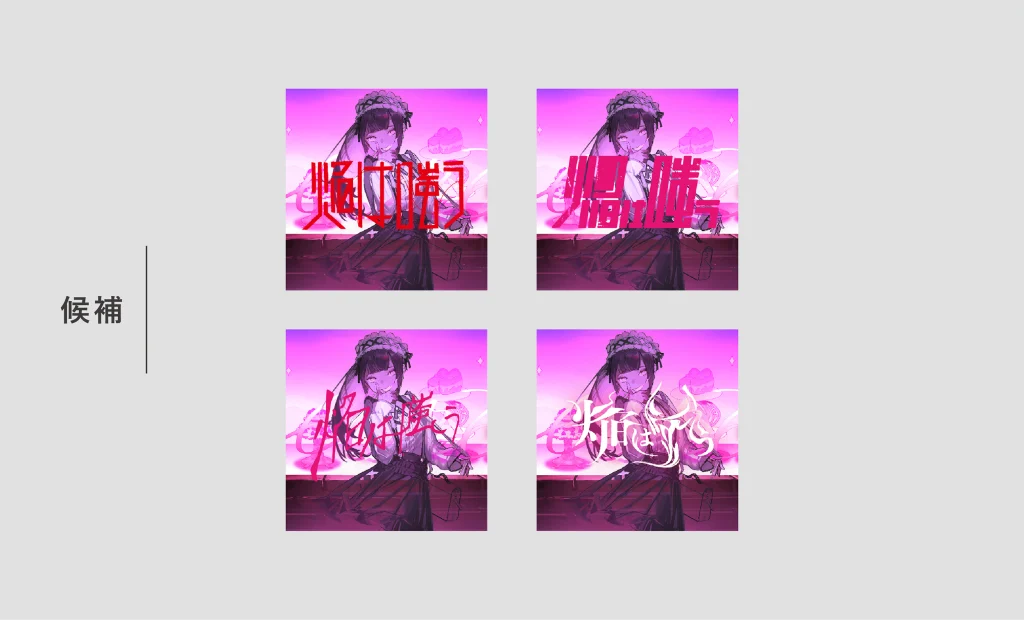 「焔=ゆらめく火」「嗤う=不敵さ・余裕・妖しさ」といった要素を軸に、楽曲イラストの雰囲気と調和するフォント選定と装飾を行っています。
